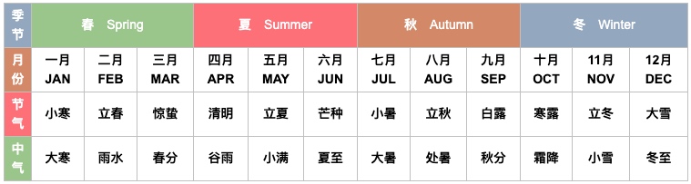 | 月份 | 节令(节) | 中气(气) |