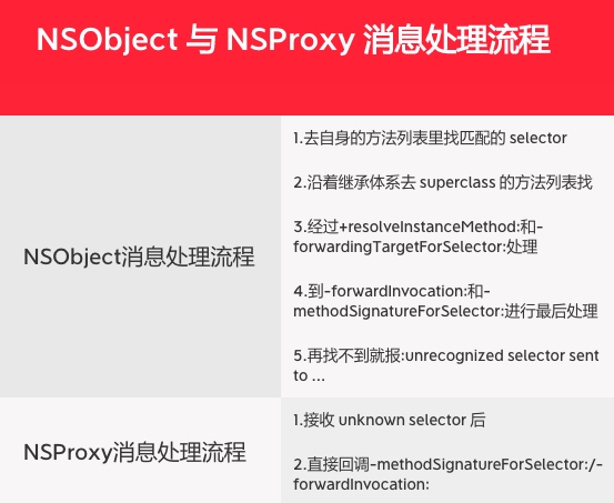 NSProxy的主要功能,负责把消息转发给真正的target的代理类;NSProxy没有继承NSObject,但是实现了NSObject协议,作为一个抽象类,它没有实现初始化方法,并且会在收到任何它不响应的消息时会引发异常;NSProxy的子类必须要实现一个初始化或创建方法,并要重写- (void)forwardInvocation:(NSInvocation *)invocation;和-(nullable NSMethodSignature *)methodSignatureForSelector:(SEL)sel方法,来转发它没实现的方法;NSProxy自省方法的默认实现是将消息forward到realObject,也就是说NSProxy会将自省相关的selector直接forward到-forwardInvocation:回调中,这些自省方法包括: