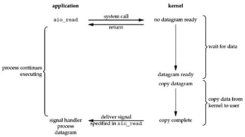 信号驱动 signal driven I/O (SIGIO) 只有UNIX系统支持,与I/O multiplexing (select and poll)相比,它的优势是,免去了select的阻塞与轮询,当有活跃套接字时,由注册的handler处理。