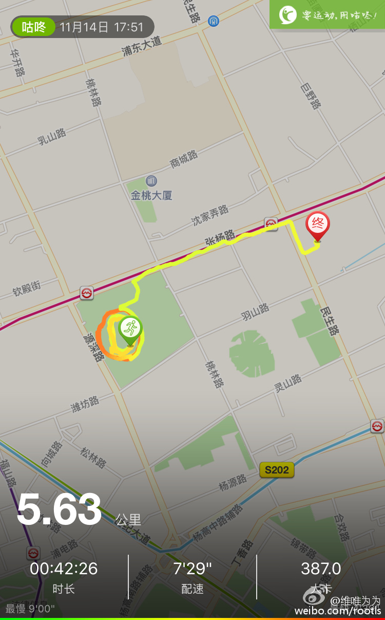 跑步5.63km,用时42分26秒,配速7’29”,387.04大卡。