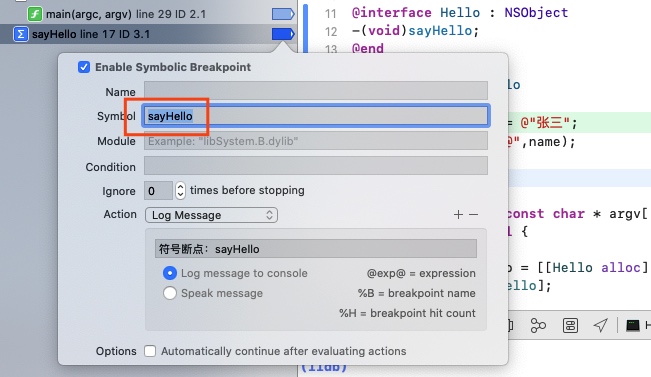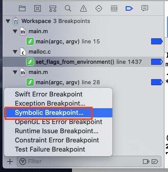 添加符号断点 我们可以使用方法名作为符号名,添加符号断点。添加符号断点左下角加号,如下图: