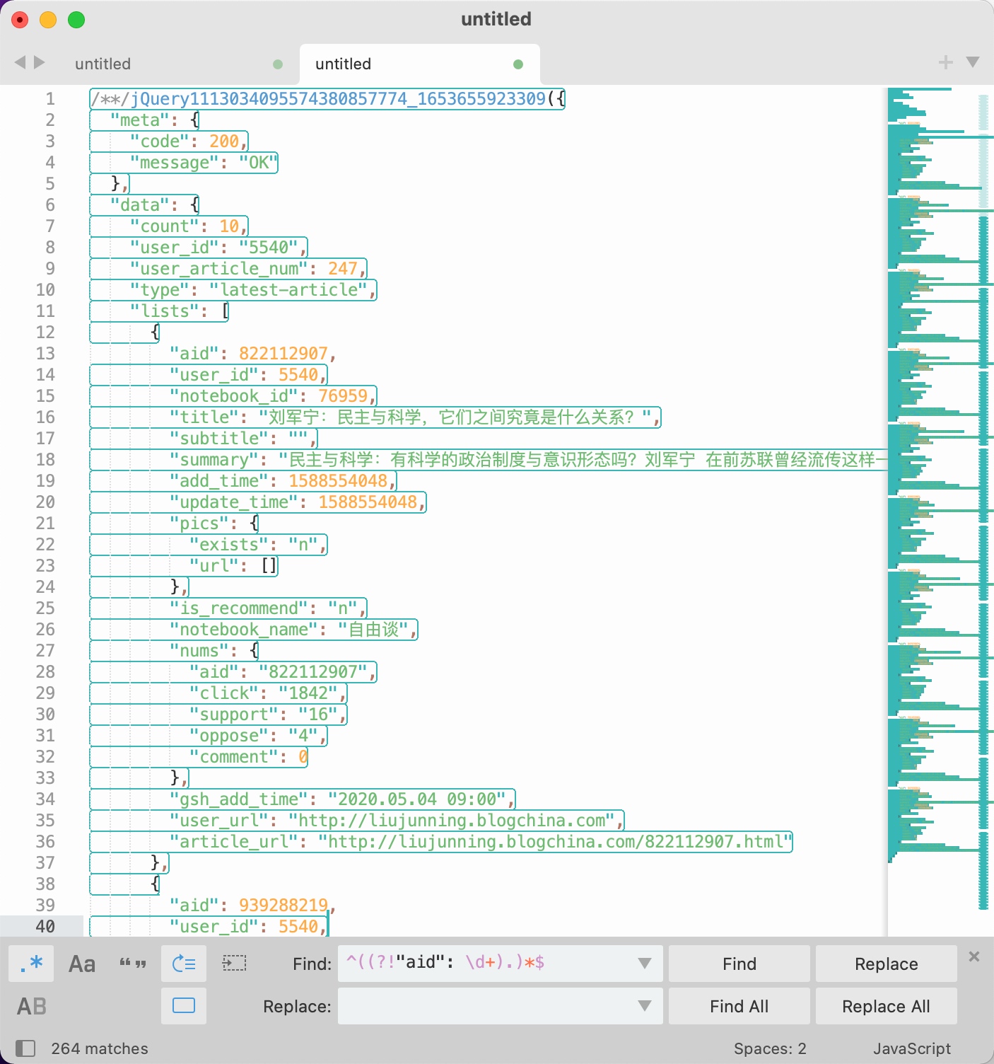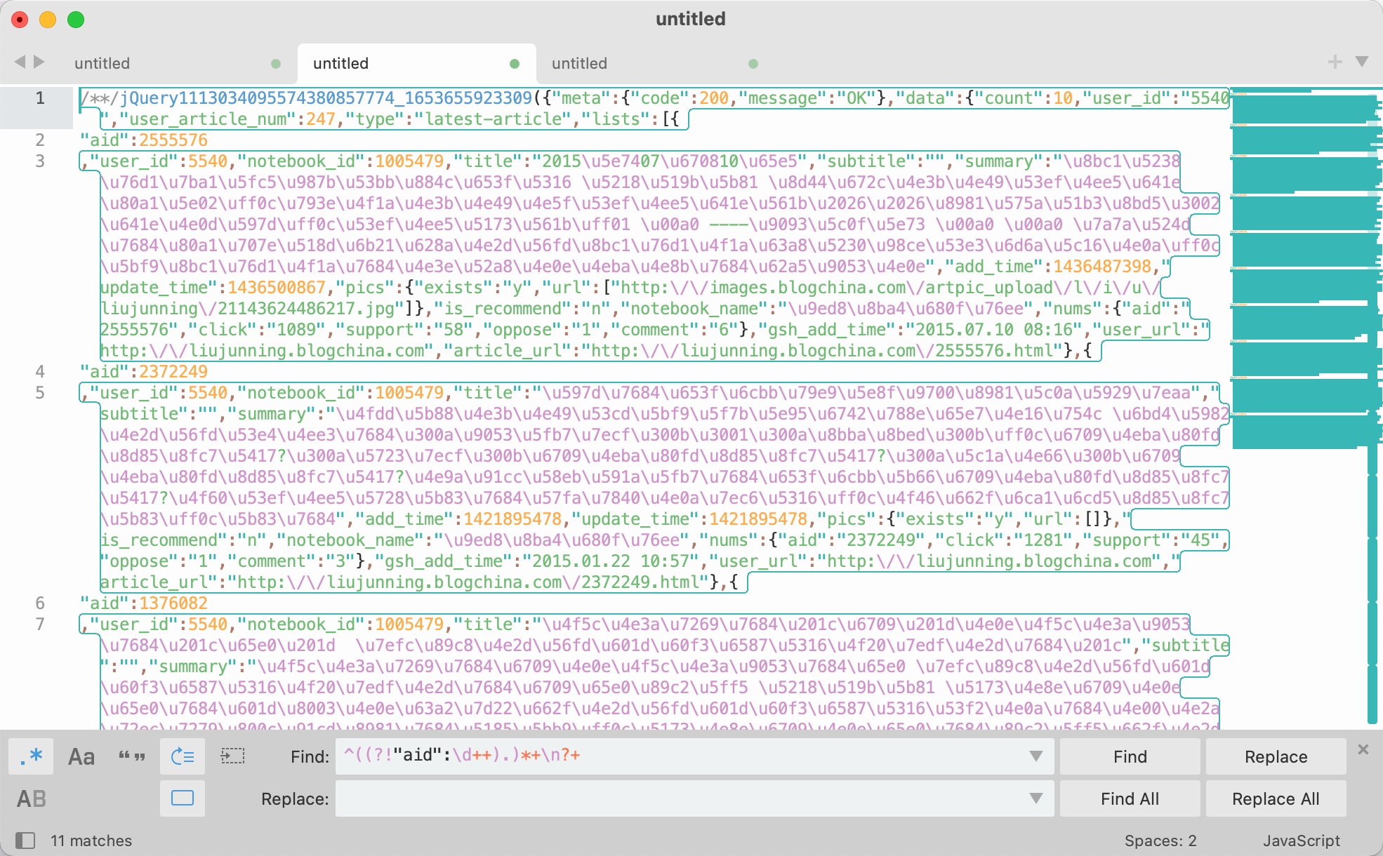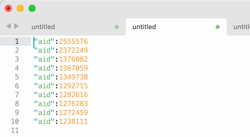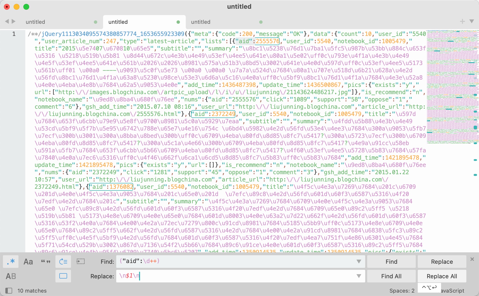1. 筛出 "aid":\d++, 匹配 ("aid":\d++) 替换成 \n$1\n